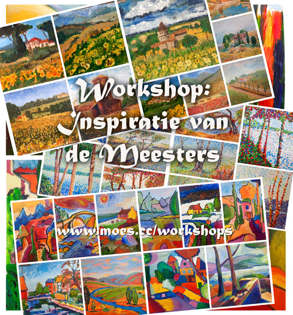 Atelier Moes geeft Schilderworkshops, tekenworkshop en workshops op maat in het Gooi Schilderworkshop Inspiratie van de meesters 3 avonden donderdagavond 7, 21 en 28 mei 2026 extra optie: 3 ochtenden dinsdagochtend 2, 9 en 16 juni 2026 "anders kijken en anders schilderen" Heeft u een nieuwe impuls nodig of uitbreiding van uw schildertechnieken? In deze praktische workshop maakt u verder kennis met verschillende schildertechnieken uit verschillende stromingen van de moderne schilderkunst. Elke les leert u op een andere manier te kijken en op een andere manier uw onderwerp te benaderen. De verschillende schilderstijlen waarin u werkt zijn achtereenvolgens het Impressionisme, Divisionisme en het Expressionisme. De avonden zullen beginnen met een korte kunsthistorische uitleg, voorbeelden en een korte demonstratie. Denk aan werken van schilders als Monet, Seurat, matisse, Derain en Marc.