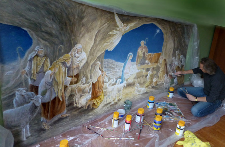 Stap voor stap opbouw van een kerstschildering: (in opdracht)